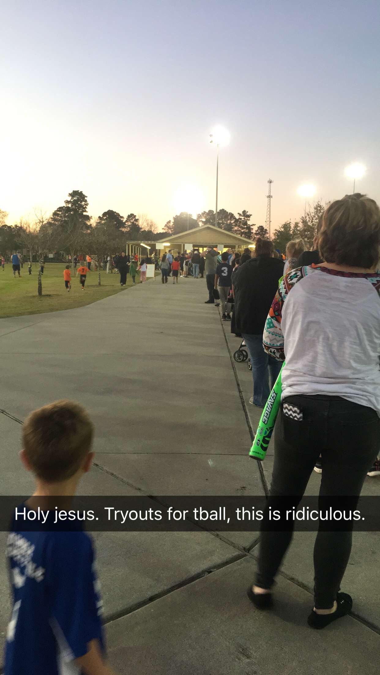The first thing you do is make sure you sign up online to get pre-registered, for our league this was always so important roster spots filled up quickly depending on how many parents volunteered or were voluntold to coach. Then take your sweet baby to Walmart, Dick’s, or Academy and buy the cutest little glove, bat, and cleats you’ve ever seen and start getting ready for tryouts. You work on how to wear the glove and hold a bat, how to say “Hi, my name is _____, and I am 3.” I mean, you or your significant other played a sport of some sort in High School or College, how hard can this be to teach your own child these things? Then just like that on a cold week night in January (we live in Texas so our season always seems to start earlier than others) you get off work, go pick up your toddler and head to the fields where you hope all the hard word you’ve been doing at night in your front yard and living room works out. When you arrive at the park you must of driven past 1,000 times but never really noticed, you join the line of other parents waiting to check their child in.